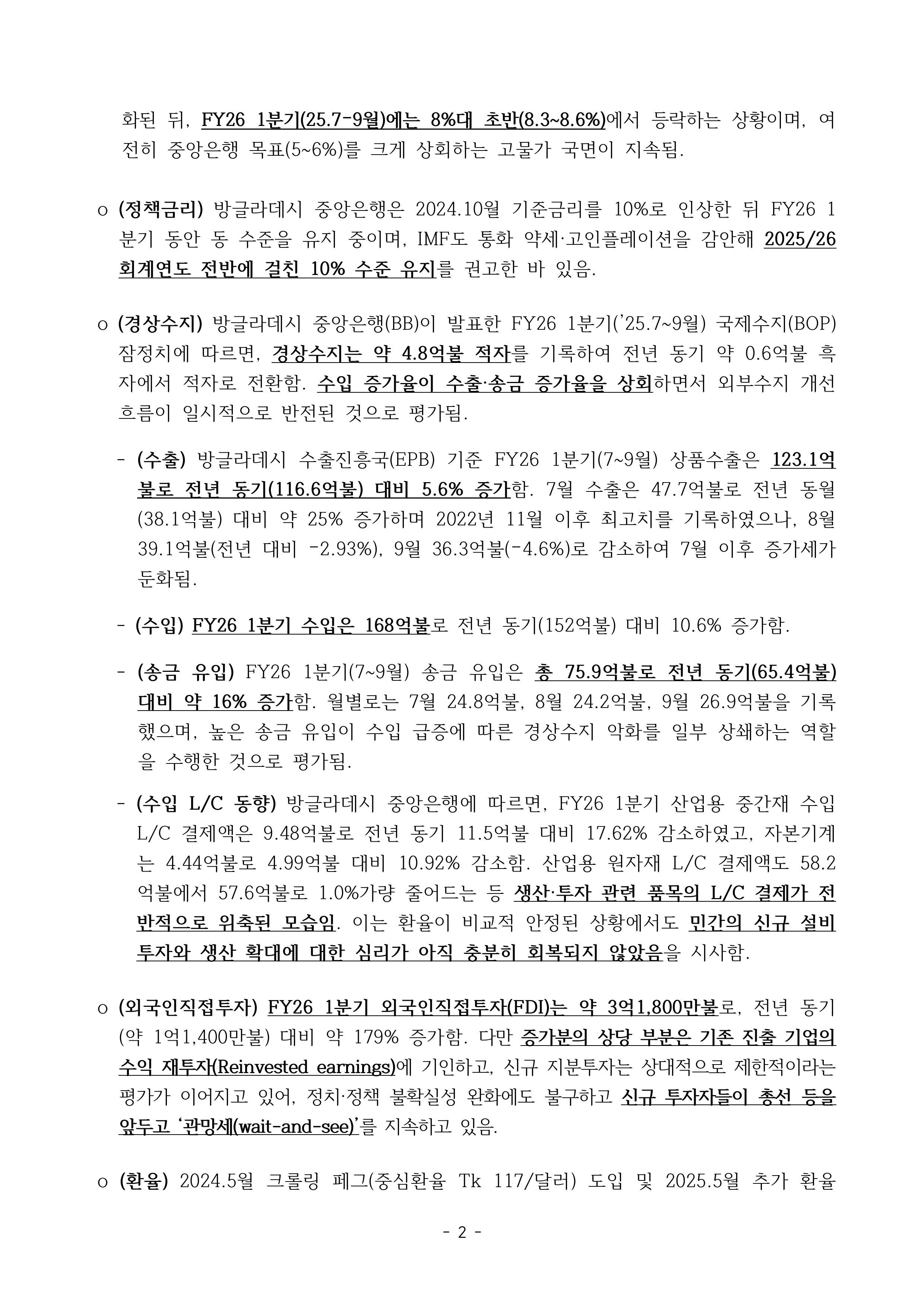 방글라데시 FY26 2분기(25.10-12월) 경제 동향