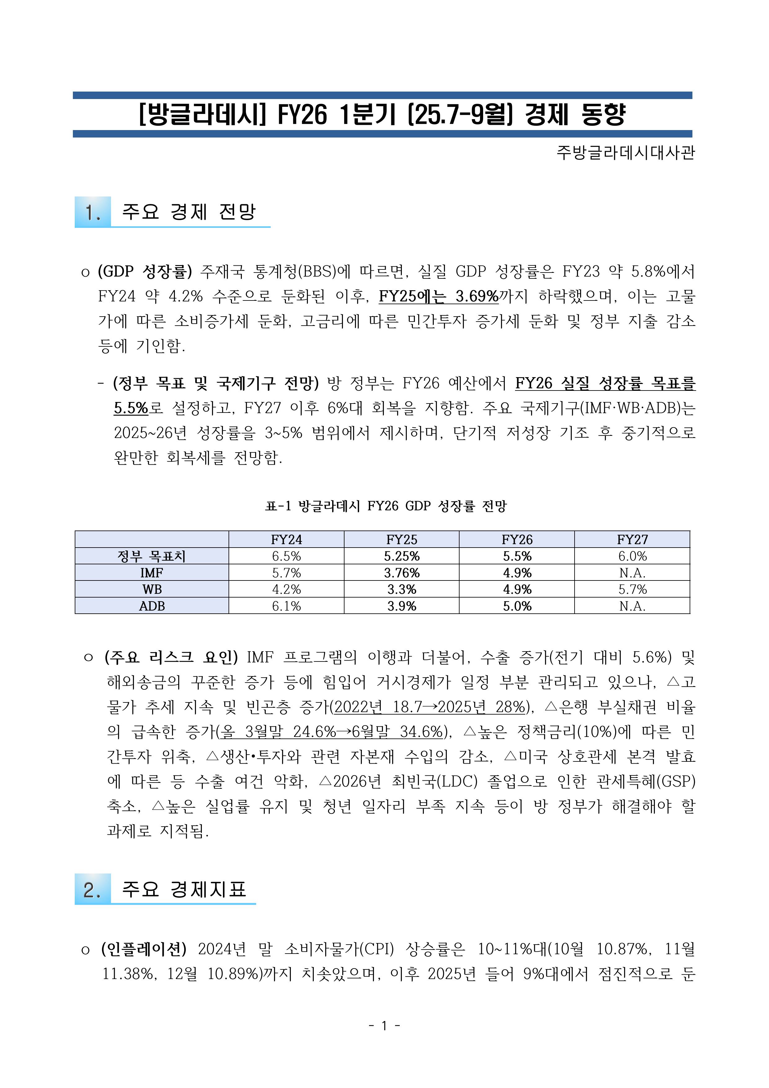 방글라데시 FY26 1분기(25.7-9월) 경제 동향