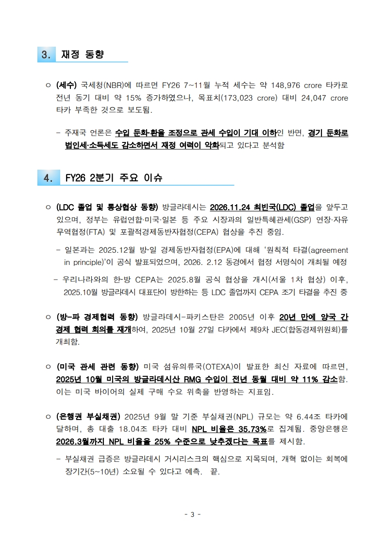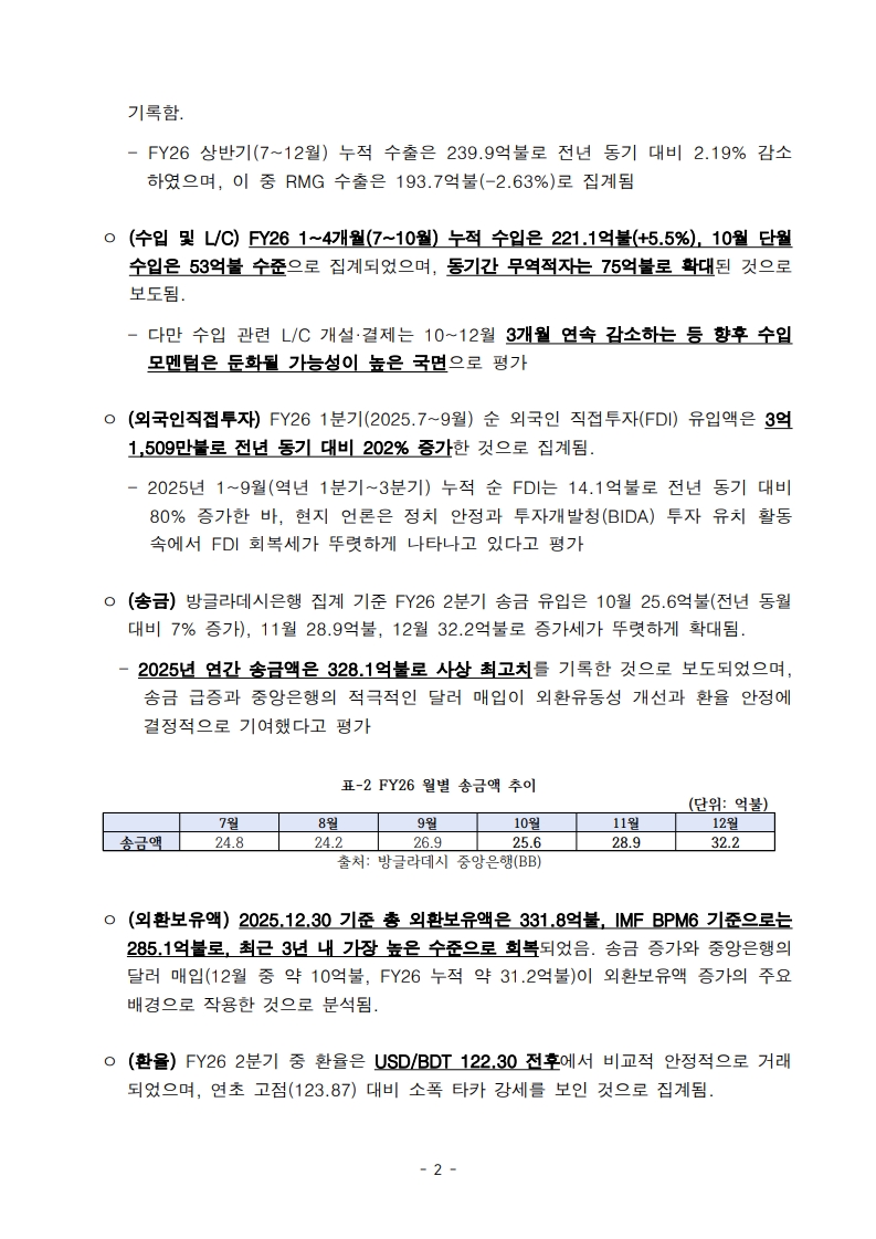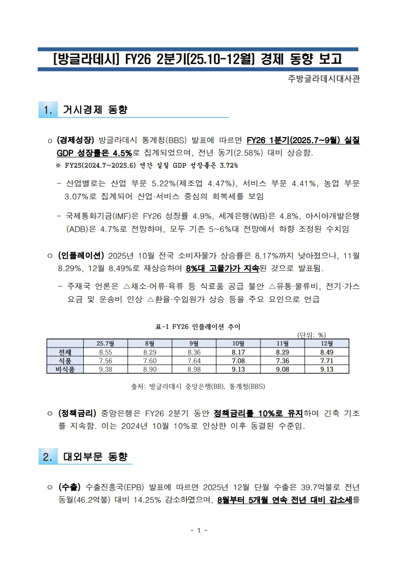 방글라데시 FY26 2분기(25.10-12월) 경제 동향