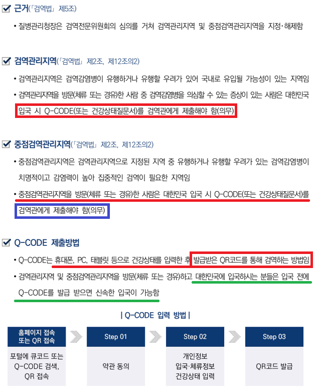 - 검역법 제12조의 2(신고의무 및 조치)에 따라 중점검역관리지역(방글라데시) 체류 및 경유자는 Q-CODE 제출 필요